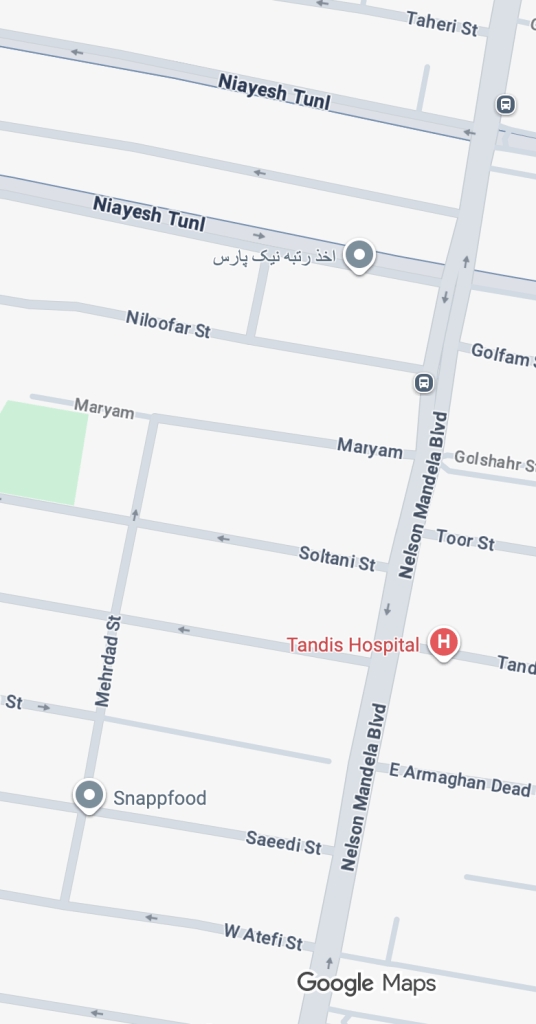 آدرس: بلوار نلسون ماندلا، کوچه سیمین، کوچه میریم، پلاک ۱۳، واحد ۴